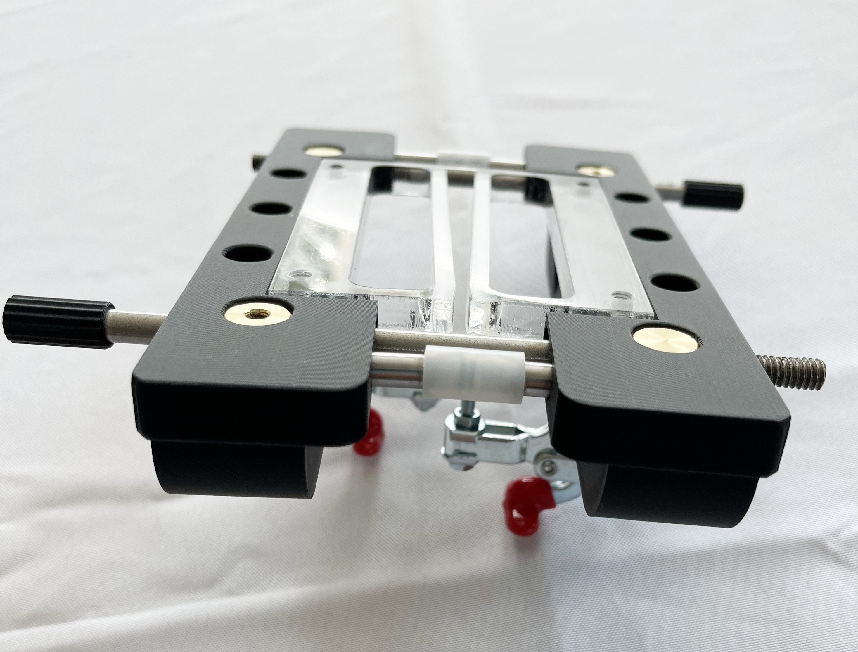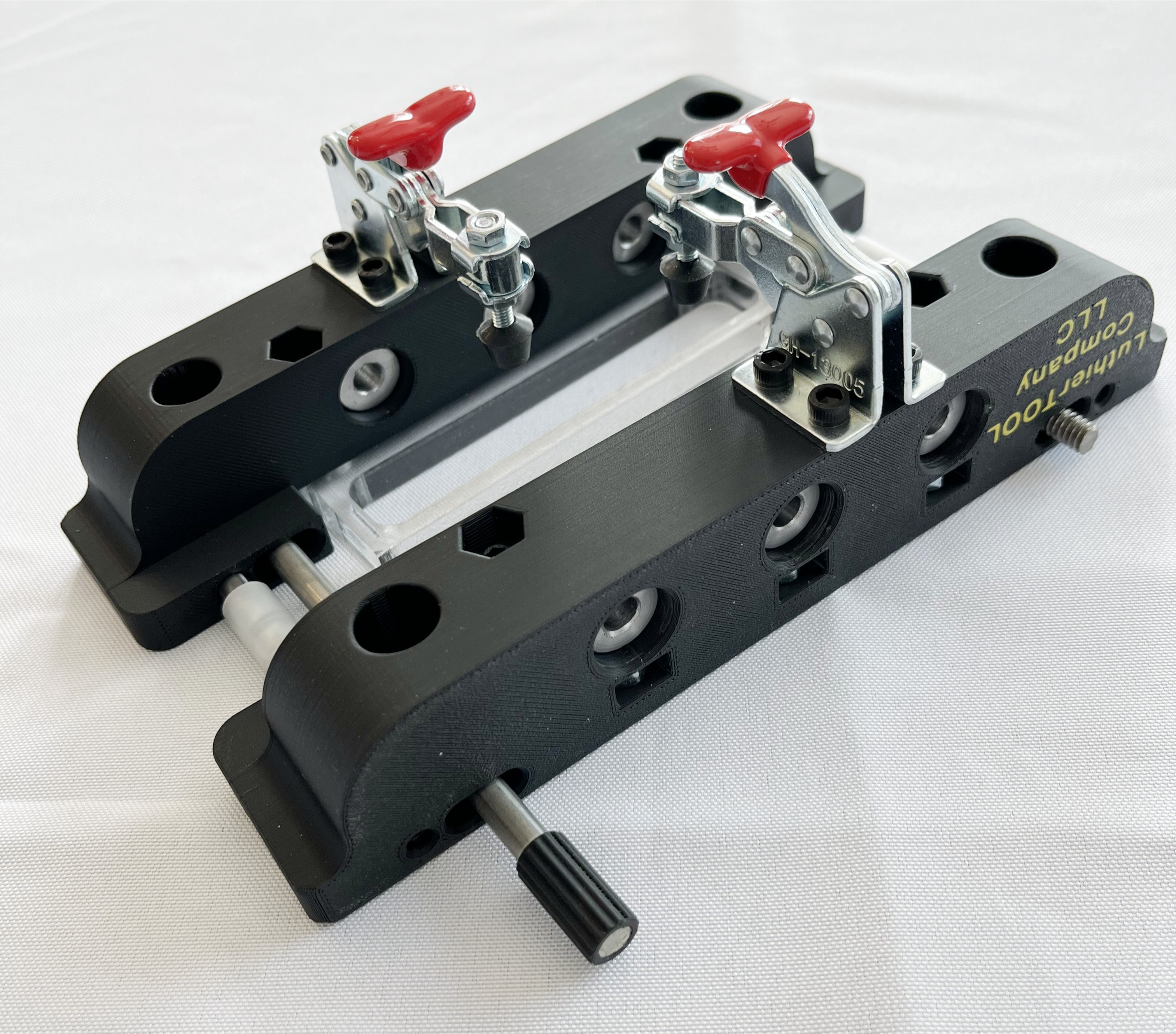 Only one set up and the tuner holes and slots can be cut. The fixture can be adjusted so that the one side is always symmetrical to the other side, keeping everything centered. This new improved version now allows for center clamping with complete height adjustment for various peg head thickness. The soft pads on the spindles will prevent any damage to the back of the peg head. This tool has become the industry standard for slot head cutting jigs. This tool is designed to be used with template guides, we DO NOT recommend using router bits with bearings, see manual.